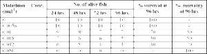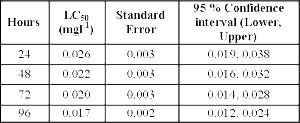 Table 2: Determination of LC50 values of malathion (EC50) on Esomus danricus.