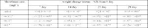Exposure to sublethal concentrations of 0.0017, 0.00017 and 0.000017 mgl-1 malathion revealed progressive decrease in body weight at weekly recordings with the mean decrease of 12.93, 10.1 and 8.35 per cent, respectively, as opposed to a 3.8 per cent mean increase in the weight of control fish, at the end of the 28 day exposure. Statistical comparisons reveal that the per cent changes in body weight of test fish at all exposure concentrations on every weekly measurement were significantly different from those of the control at p < 0.05. The lowest exposure concentration (0.000017 mgl-1) upto 14 days of exposure showed no significant changes when compared to changes in weight at initial exposure duration while other two higher concentrations showed significant decrease at each exposure duration (Table 3).