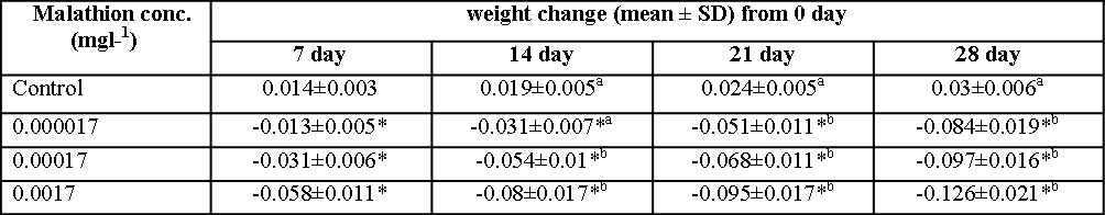 Table 3: Weekly changes in weight (g) of control and test Esomus danricus during a 28-day exposure to malathion (EC50). ‘-’ Indicates decrease; *Significantly different from Control at p < 0.05; ‘a’ indicates no significant difference and ‘b’ indicates significant differences at p < 0.05 amongst values.