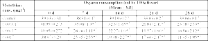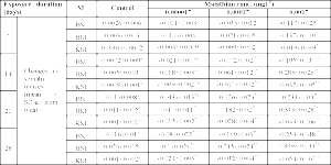 BSI, KSI and HSI values at the beginning of the experiment (0 day) and in the four successive weekly measurements were not significantly different among one another in control. The three sublethal doses, in contrast, decreased BSI by 21.55, 14.28 and 6.76 per cent; and KSI by 24.94, 14.93 and 9.87 per cent; but increased HSI by 20.98, 12.87 and 5.23 per cent; respectively. Statistical analysis revealed that significant reduction in BSI was discernible from 7, 14 and 21 day onwards in 0.0017, 0.00017 and 0.000017 mgl-1 exposure respectively (p<0.05). HSI at 0.00017 and 0.000017 mgl-1 upto 7th and 14th day of exposure respectively, showed no significant difference with control; while the highest sub lethal concentration (0.0017 mg l-1) showed significant difference with control at all exposure intervals. KSI at 0.0017 and 0.00017 mgl-1 at 7, 14, 21 and 28 day of exposure showed significant difference with control while the lowest sub lethal concentration (0.000017mg l-1) upto the 7th day of exposure showed no significant difference but thereafter showed significant difference with the control upto 28th day of exposure (Table 4).