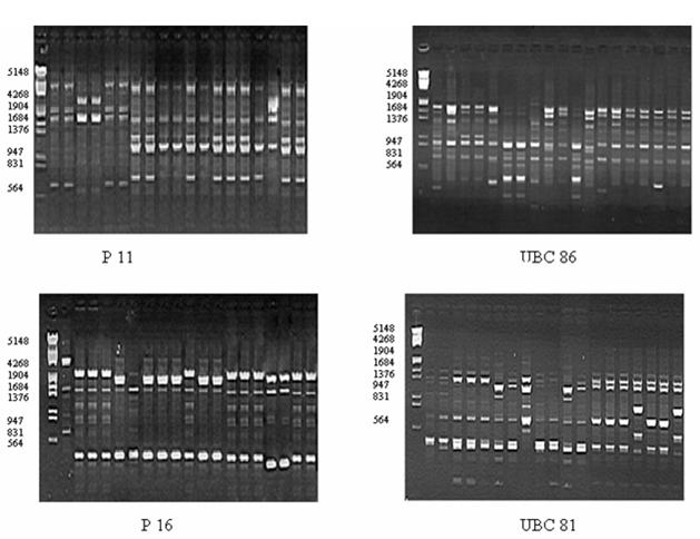 84 different random decamers (50 from UBC, 34 from Operon) were screened initially. RAPD reaction and procedures were carried out as described by Williams et al.,(1990) with some modifications. The PCR reaction mixture consisted of 50 ng template DNA, 1 x PCR buffer (10 mM Tris-HCL pH 8.8, 25mM KCL, 15mM MgCl2), 200 μM dNTPs (Bangalore Genei Pvt. Ltd., India), 0.2 μM 10-base random primers and 1 unit of Taq polymerase (Bangalore Genei Pvt. Ltd., India), in a total volume of 25 μl. The PCR reaction was carried out in My cycler thermal cycler (Biorad, USA). The PCR amplification conditions for RAPD consisted of initial extended step of denaturation at 940C for 4 minutes followed by 44 cycles of denaturation at 940C for 1 min, primer annealing at 370C for 1 min and elongation at 720C for 4 min with a final extension at 720C for 10 minutes. Amplification products were separated on 1.5 % agarose (SRL, India) gel in 1X TAE buffer along with a DNA ladder (Fermentas). The DNA bands were photographed using the gel documentation system (Alpha Innotech, USA).
