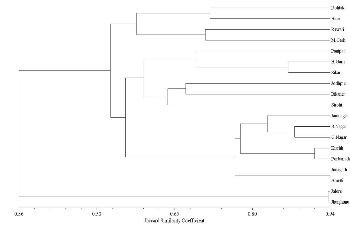 Table 3: UPGMA dendrogram of 19 accessions of Salvadora oleoides based on 16 random RAPD primers. (1-Rohtak, 2-Hisar, 3-Panipat, 4-Rewari, 5-M.Garh, 6-Jodhpur, 7-Bikaner, 8-Sirohi, 9-Jalore, 10-H.Garh, 11-Jhunjhunu, 12-Sikar, 13-Jamnagar, 14-Bhavnagar, 15-G.Nagar, 16-Kuchh, 17-Junagarh, 18-Porbandar, 19-Amreli).