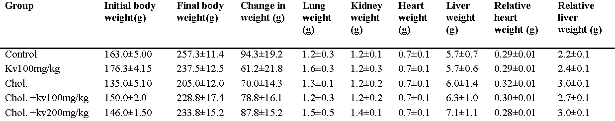 Table 1 depicts the effect of kolaviron (kv) on body weight, visceral organ weights and relative organ weight of cholesterol – fed rats.