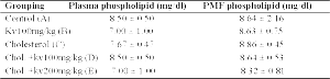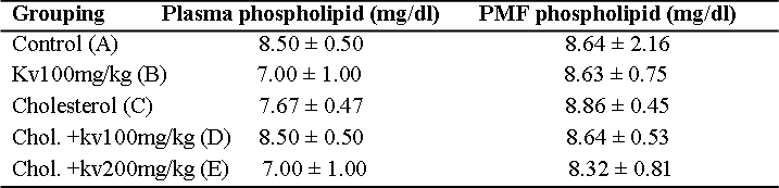 Table 2 shows the effect of kolaviron on the plasma and PMF phospholipid levels. No significant difference (p<0.05) was observed in the plasma and PMF phospholipid levels of the cholesterol – fed rats (Group C) when compared with the pretreated groups (D and E).