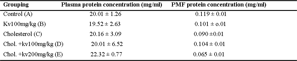 Table 3: Effect of kolaviron on plasma and PMF protein concentrations. Data are mean ± SD (n=4). P< 0.05 compared with control. Chol. Cholesterol, Kv. Kolaviron.