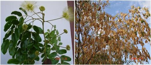 A large deciduous tree with pinnately compound leaves. Leaves have glands at the base of the petiole. Flowers clustered in globose heads, White and fragrant. Fruit is a pod, straw coloured. This tree is cultivated in all the districts for Cattle feed. This tree has wide distribution in old tropics.