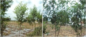 The farmers of Thanjavur, Trichy, South Arcot, and Chengalpet districts in Tamil Nadu, are cultivating annual food crops along with Casuarina equisetifolia. Farmers grow groundnut (Arachis hypogea) or melons on sandy soils. Sesame (Sesamum indicum) in red soil, Turmeric (Curcuma sp.) in heavy soil as an intercrop with Casuarina in the first year. When banana (Musa sapientum) and tapioca (Manihot utilissimum) are raised as intercrop under irrigated condition Casuarina added more nitrogen to soil, such intercropping is not possible beyond the first year of Casuarina growth due to over shading2. However Casuarina equisetifolia can be intercropped with Moringa olifera alternatively at an espacement of 2 m up to the age of 3 years Casuarina equisetifolia reached a pole of 3-4 m height with a basal girth of 28 cm. Income from the Casuarina equisetifolia amounted to Rs 14966 and Moringa olifera Rs 38055 over the period of three years1. Vinay Rai and Suresh3 showed that some fodder grasses registered an increase in growth when intercropped with C. equisetifolia.